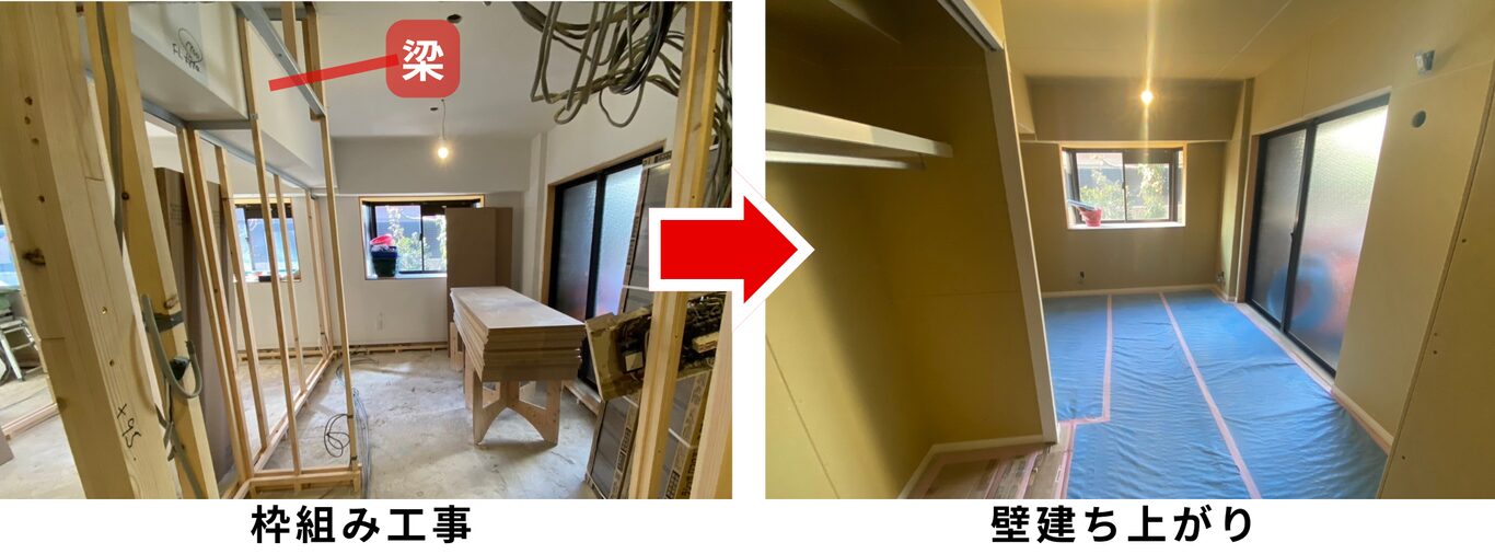 もともと1つの居室は真ん中の梁に合わせて壁を設けて、2つの居室になりました。