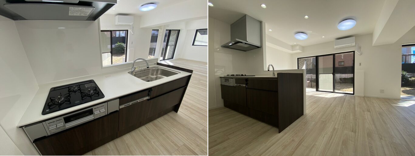 上記にあったように居室が1つから3つになりましたが、リビングの開放感は落としません。キッチンは壁につけずカウンターキッチンを採用することで、リビングが抜けて見えます。