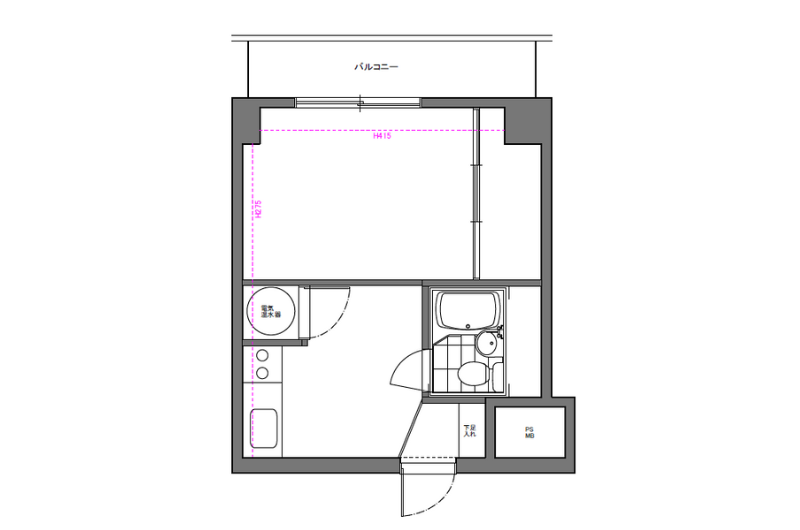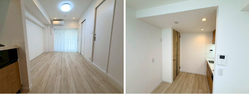 今回のリノベーションでは、1Kの壁を取っ払って1Rに変更し、廊下やドアを減らすことで使えるスペースを広く確保します。