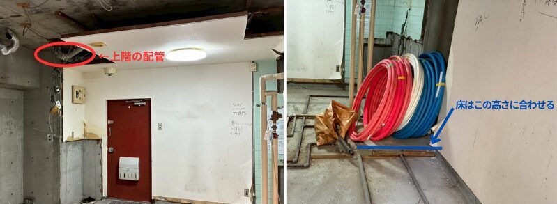 上階の配管の影響を受けない居室部分は、できるだけ天井の高さを上げて、少しでも開放感を確保します。