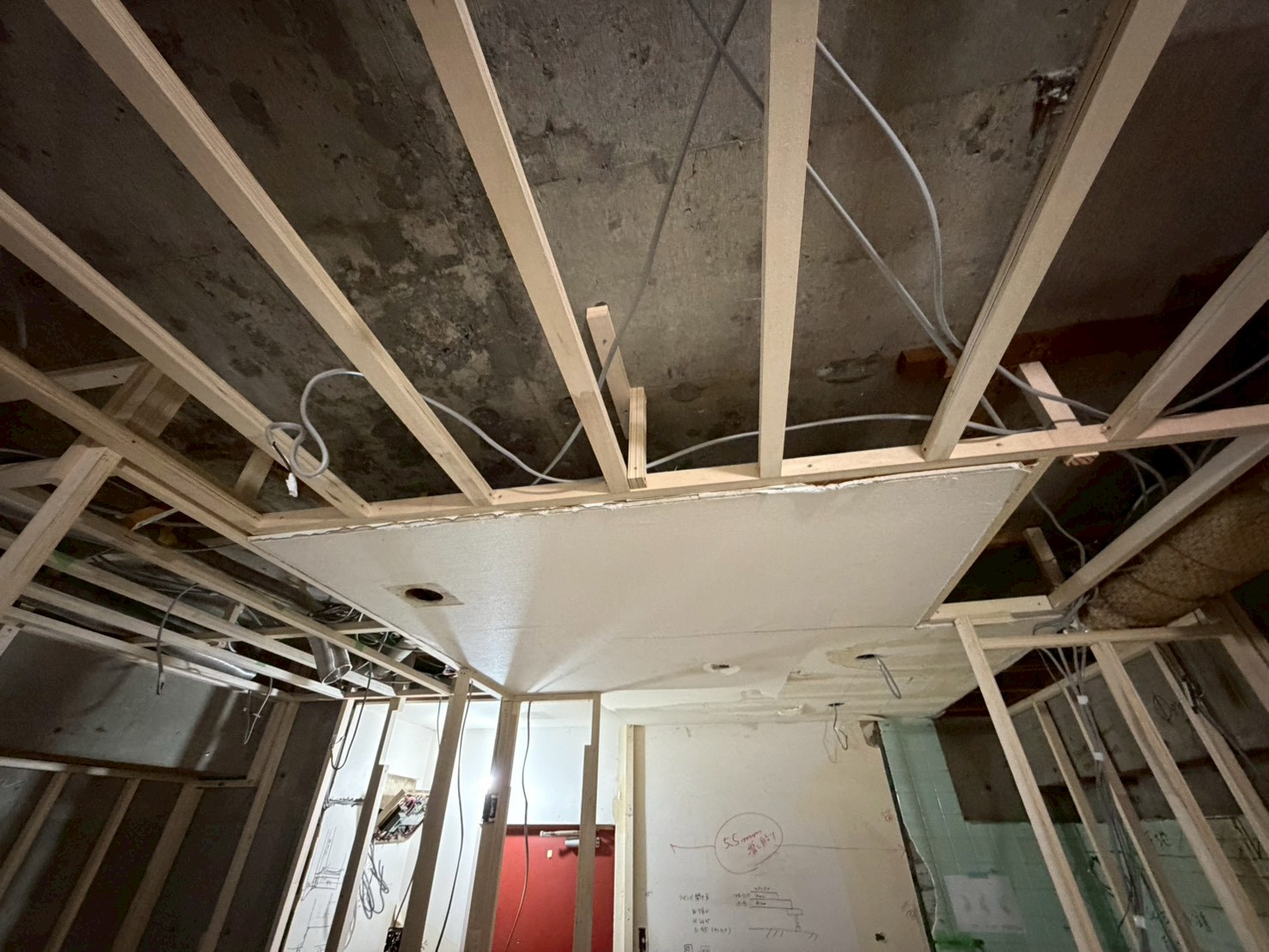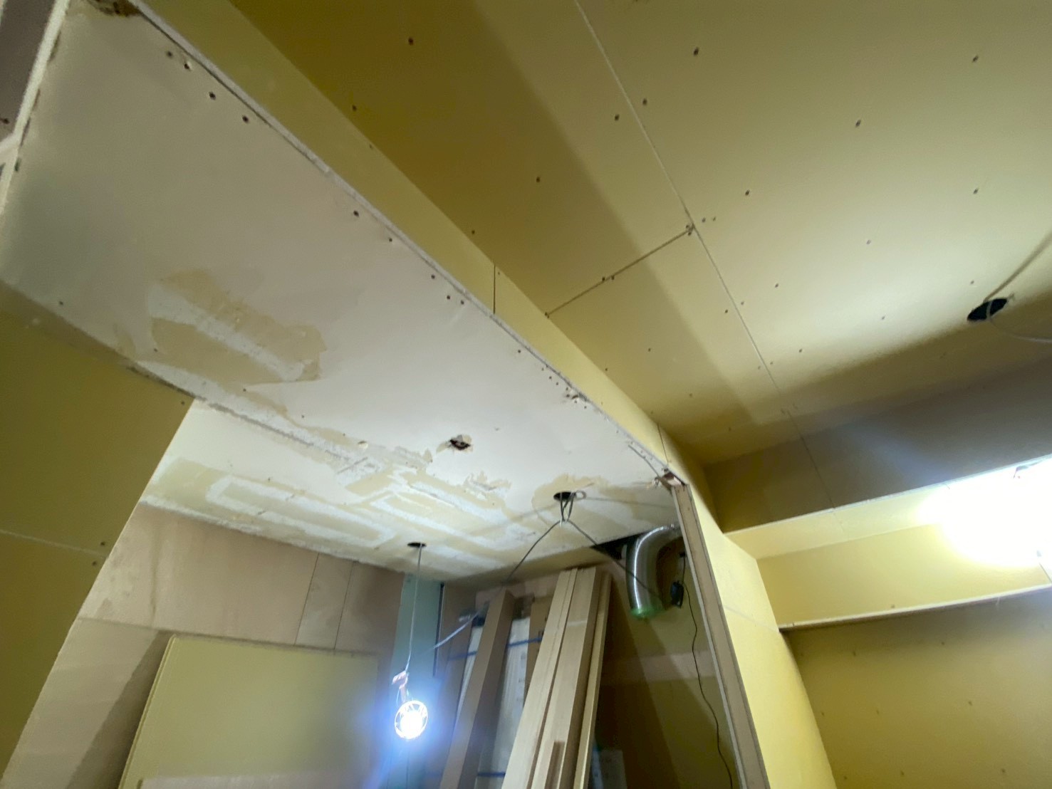 上階の配管があって手を加えられない天井はそのまま残し、それに合わせるように周りの天井を設置していきます。