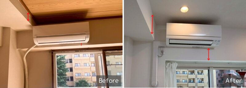 この居室部分の天井は、以前はキッチンに合わせて低くなっていましたが、今回の計画では見直し、限界まで高さを確保しました。エアコンの配置を比較すると、どれだけ天井高が上がったかが一目で分かります。