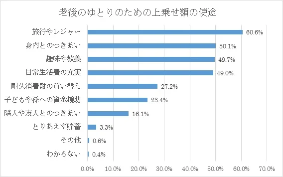 主な使途は、「旅行やレジャー」がもっとも高く、以下は「身内との付き合い」、「趣味や教養」、「日常生活費の充実」と続きます。