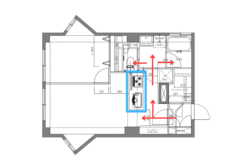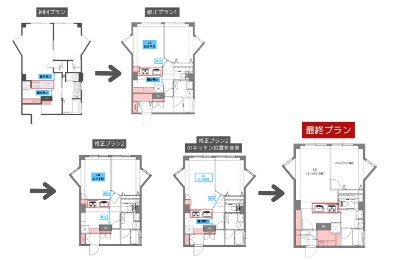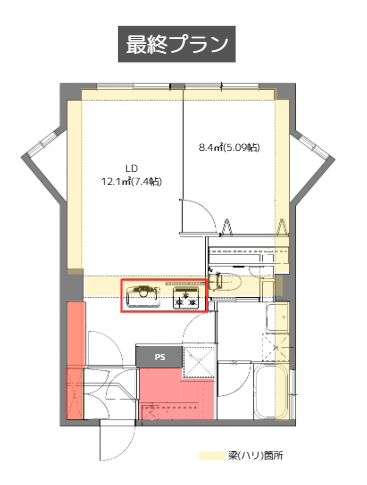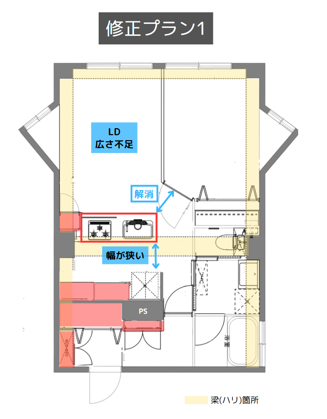 初回のプランでは、梁(ハリ)の位置を考慮してキッチンの配置を決めていました。しかし、キッチンとLD(リビングダイニング)への通路幅が狭くなり、大型家電や家具の搬入が困難になる懸念がありました。