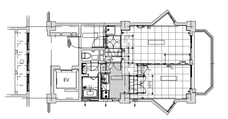 玄関から入って右手、キッチンの背後にあるPS(パイプスペース)が中央に位置していたため、動線の妨げとなっていました。間取りを少し変更するだけでも大きなレイアウト変更が必要となり、調整に苦労しました。