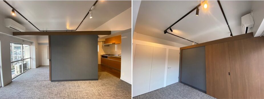このような壁の上部が開いたつくりを、天井までしっかりと仕切る形に変更することで、それまで一続きであった空間を明確に分割し、居住用の空間としての機能性を高めていきます。