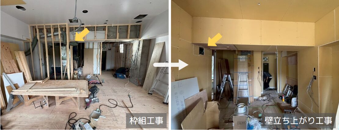 解体が完了し、枠組工事を経て壁が立ち上がることで、間取りの完成イメージがより鮮明になってきました。