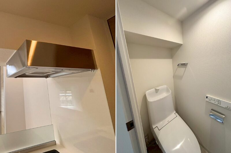 解体後に試行錯誤を重ねたキッチンの配置と排気ダクトは、トイレタンクの上にすっきりと収め、薄型レンジフードへとつながることで、美しく整理された仕上がりとなりました。