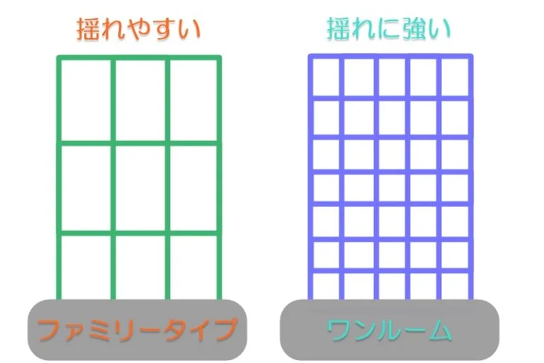 これはファミリータイプなどに比べてワンルームマンションは一つ一つの戸が小さく、マンション内にたくさんの柱を通すため、図らずも揺れに強い構造となっていることが主な要因です。
