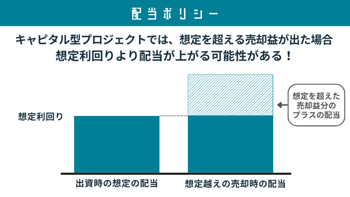 このように、投活ではキャピタルゲイン型プロジェクトで売却額が想定の利回りを上回ったら、その分を配当に還元しています。