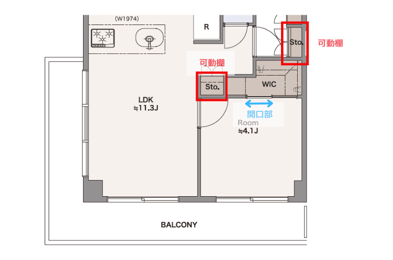 また、シューズボックス横とLDKには自由度の高い可動棚を設置しています。アパレル業界でモノが多い人でも、こだわり空間を作れる様に生活感をなくして隠した収納ができます。