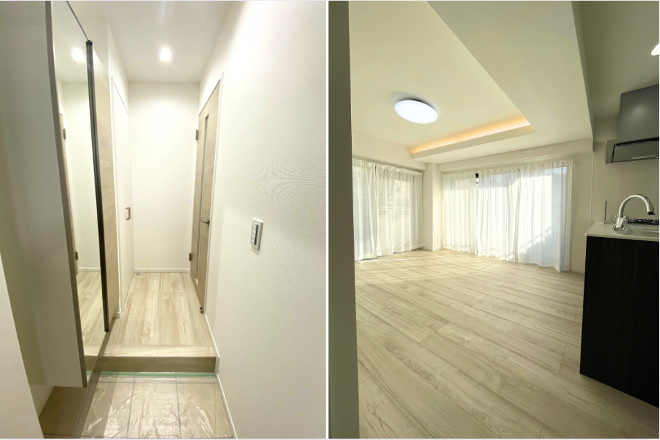 玄関に入ってすぐDKがあったコンパクトな間取りから、単身者に人気の1LDKに変更します。