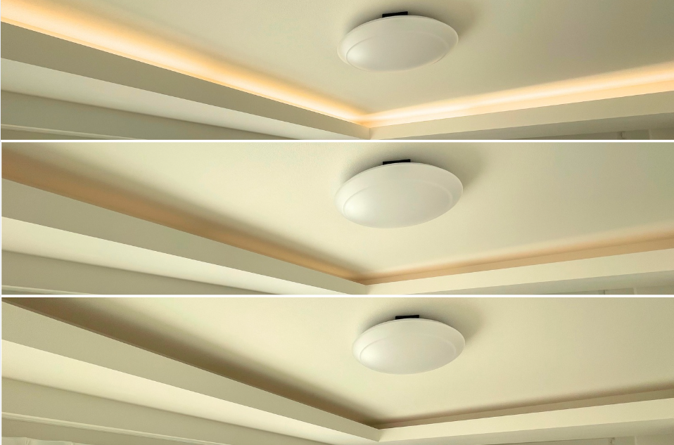 おしゃれ空間を演出するための間接照明は、調光機能が付いているので間接照明だけにすると夜のリラックスタイムに、調整して暗くすると映画見る時に、いろいろなシチュエーションで空間を彩ることができます。