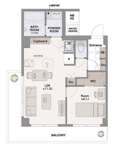 キッチンと同色のカップボードは、専用の炊飯器置場もあり、一人暮らしに十分な収納スペースです。