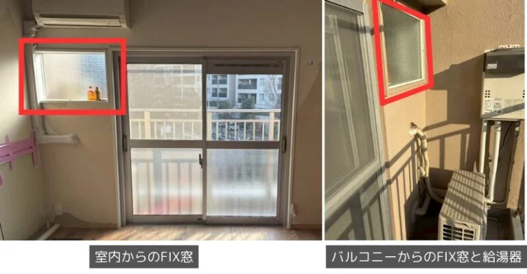 ※赤枠部分が今回透明ガラスへ変更するFIX窓。外側には給湯器が設置されています。