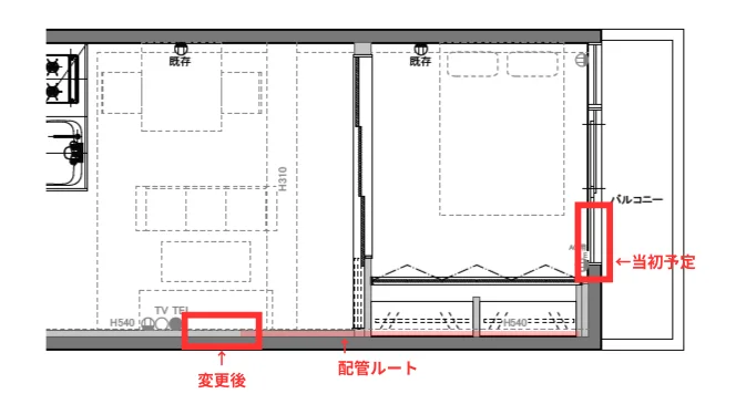※赤枠は当初の設置予定位置と、今回変更した設置位置、下部のラインが配管を通す想定ルートです。