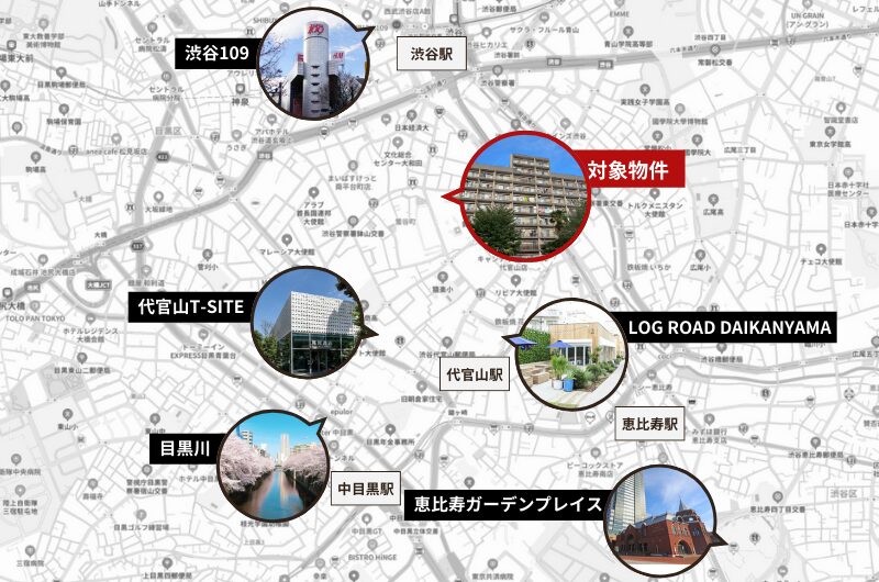 交通:JR山手線・湘南新宿ライン・埼京線、東京メトロ半蔵門線・銀座線・副都心線、東急田園都市線・東横線・京王井の頭線「渋谷」駅徒歩7分/東急東横線「代官山」駅徒歩13分